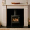 The Elemental Buckingham is a fine example of the carver’s art with finely worked corbels supporting a generous mantel shelf and frieze and pilasters with elegant inset panels. Fabricated in finest statuary marble, it is shown with Chesneys’ Beaumont gas stove.