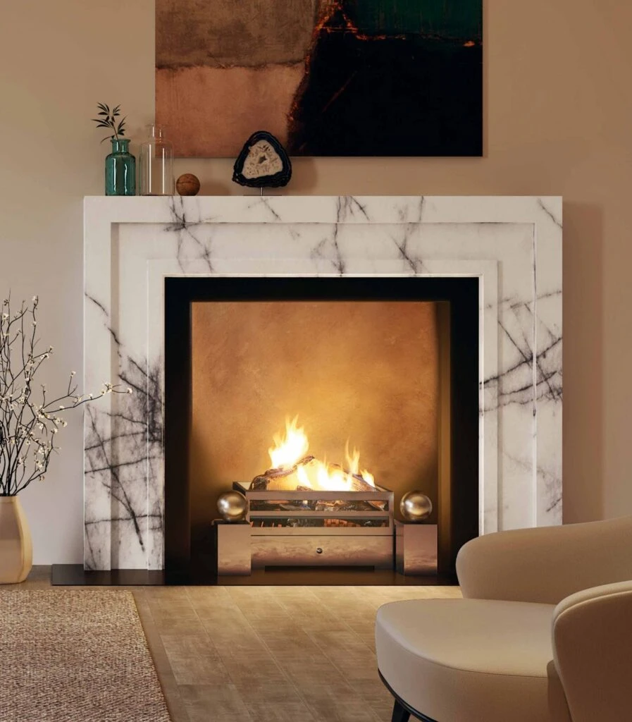 The Manhattan Luxe is shown with slate slips and hearth and Spherical steel fire dogs, Soho fire basket and gas effect fire, all from the Chesneys range.
