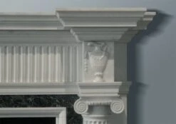 An 18th century neo-classical chimneypiece which shows the influence of Robert Adam. It has fluted Ionic columns supporting an entablature decorated with classical urns and ewers with inset marble panels in contrasting colours to the statuary marble.