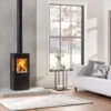 The Contura 320TG combines heat retaining, natural-veined soapstone with the polished lustre of its contemporary glass door. The log box has ample space for large pieces of firewood.