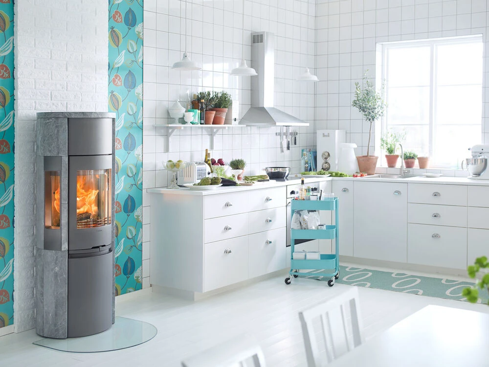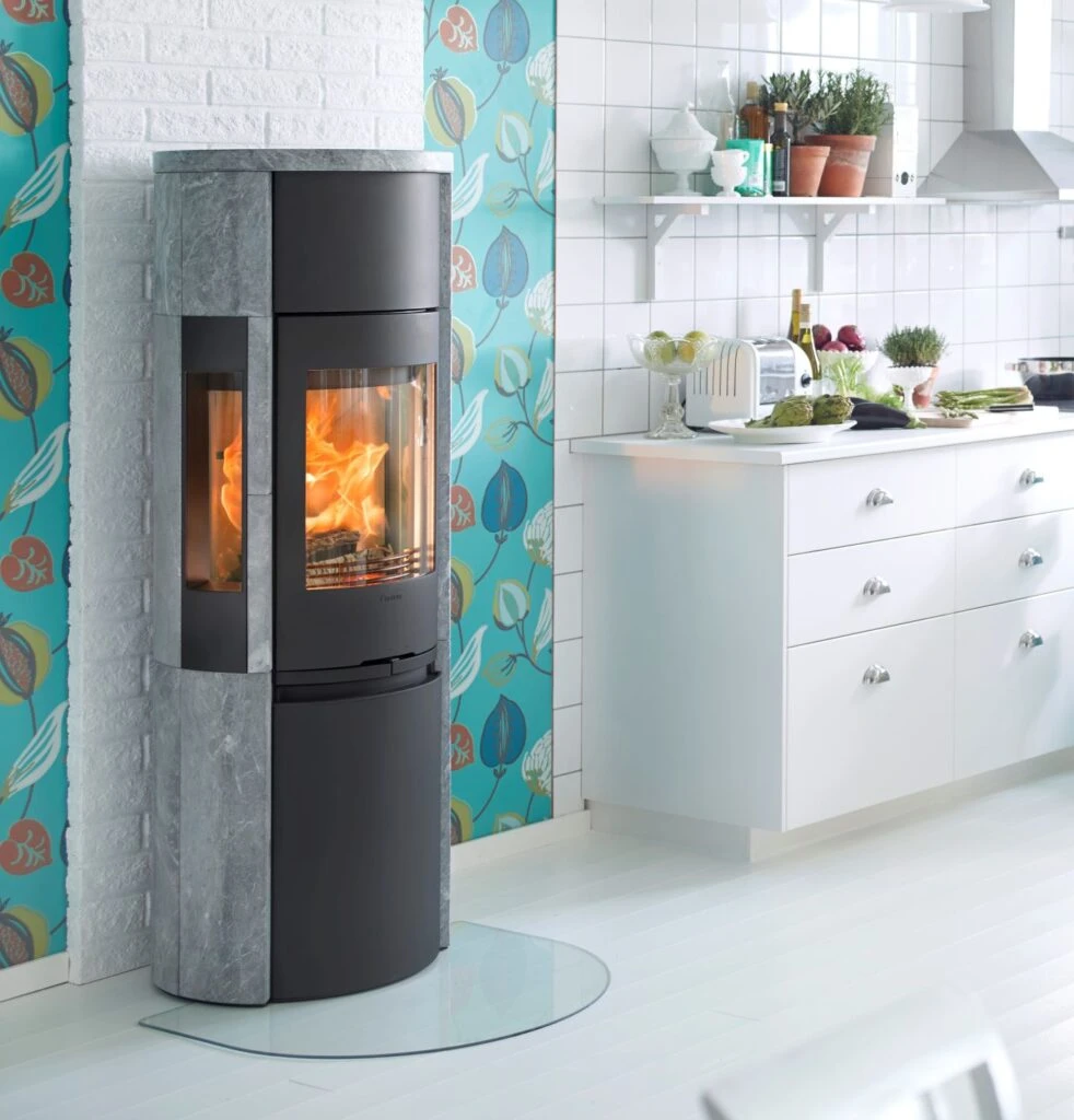 With a surround of heat-retaining soapstone that goes around the sidelights, you see a lot of the fire while the heat lasts for a long time. A lot of people choose to add heat-retaining Powerstone or a fan to the Contura 596T to gain an extra boost to the heat.