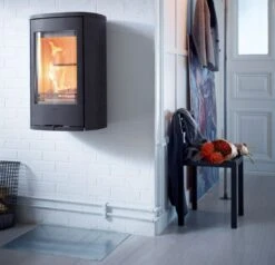 The wall-mounted model has large glass side panels creating a floating and lively stove. Available in black and grey. The Contura 810W can also be mounted in a corner.