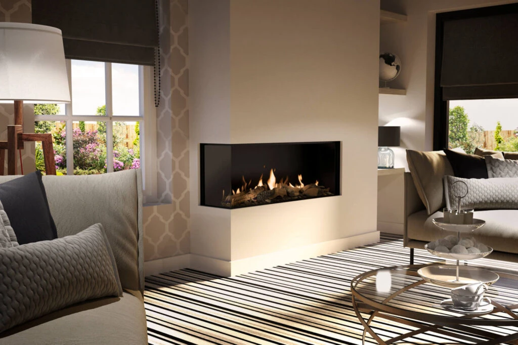 Global 120 Corner BF is a classic contemporary 1.2 metre wide gas fire with a return section that gives it an added dimension. It features inspiring log, stone or anthracite glass fire displays and energy efficiency of 88%.Its expansive glass window lends itself to a variety of locations, such as room dividing walls and room features.