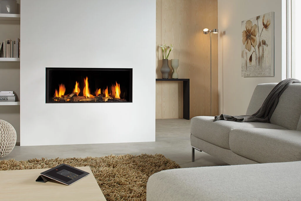 Metro 100XT Eco Wave is a beautiful 1 metre wide letterbox gas fire. It has large rustic logs and high, realistic flames. It is completely frameless, with an uninterrupted view of its fire display. It has a smooth black interior, throwing the flame picture into sharp relief or a Ceraglass, mirrored finish, which adds visual depth to the flames.