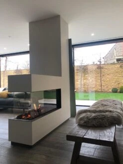 With this U-shaped gas fire you can divide your living space and still enjoy the luxury of a warm, realistic log fire from wherever you sit. It has a generous window glass height of 41 cms. There are new realistic blown logs, white stones or anthracite glass fire beds, with interiors in mirrored Ceraglass, black or ribcast.