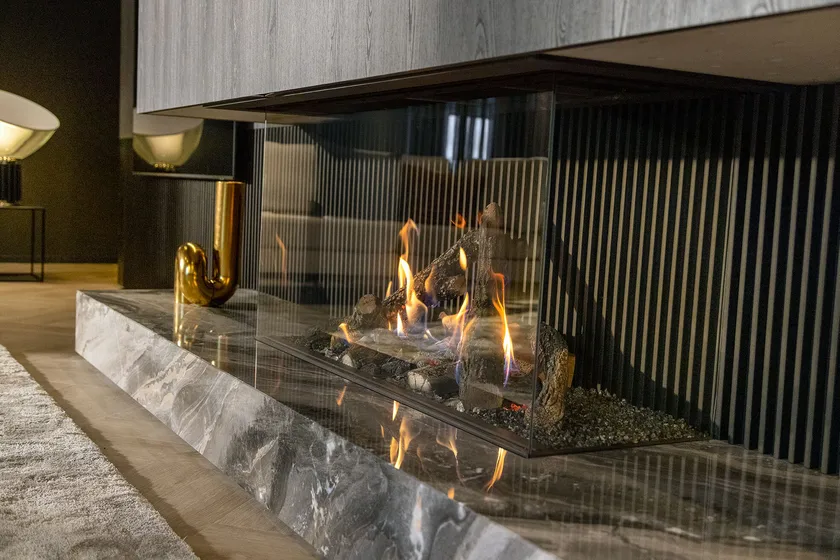 Kalfire Gi115/75S is a three-sided gas firebox. Facade dimensions: WxH 1150×750 mm. The new Gi technology provides an extraordinary fire pattern with significantly lower gas consumption. The Kalfire Gi fireplace can burn a mixture of hydrogen and gas without requiring any modifications, and can also run on natural gas or propane. The model is equipped with a patented “Prestige” burner. The burner’s three independent gas valves provide a dynamic flame performance virtually indistinguishable from a wood-burning fireplace, but with remarkable efficiency and low gas consumption. The burner is built along its entire length into ceramic logs, which themselves are installed in the hearth in the form of a pyramid. This produces tall, dancing flames that seem to come directly from the logs.