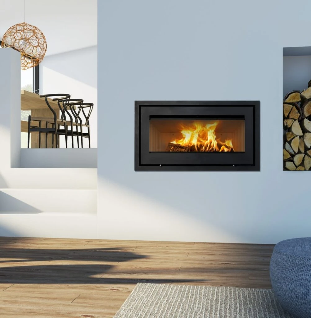 The market’s most elegant and stylish fireplace insert. Besides selection of sizes of stoves it is also possible to customise the frame around the stove, so the frame can cover e.g. a large integration hole. The clean design of the handles gives the fireplace insert a beautiful finish and a unique experience of the fire without the problems of an open fireplace.