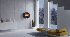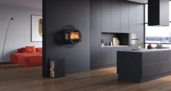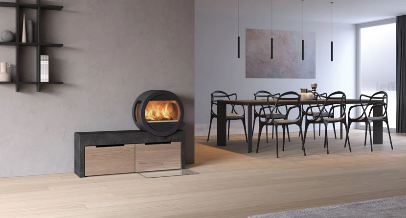 A circular front and cylindrical body create a stunningly unique stove, demonstrating cutting-edge Nordic design and engineering in equal measure.